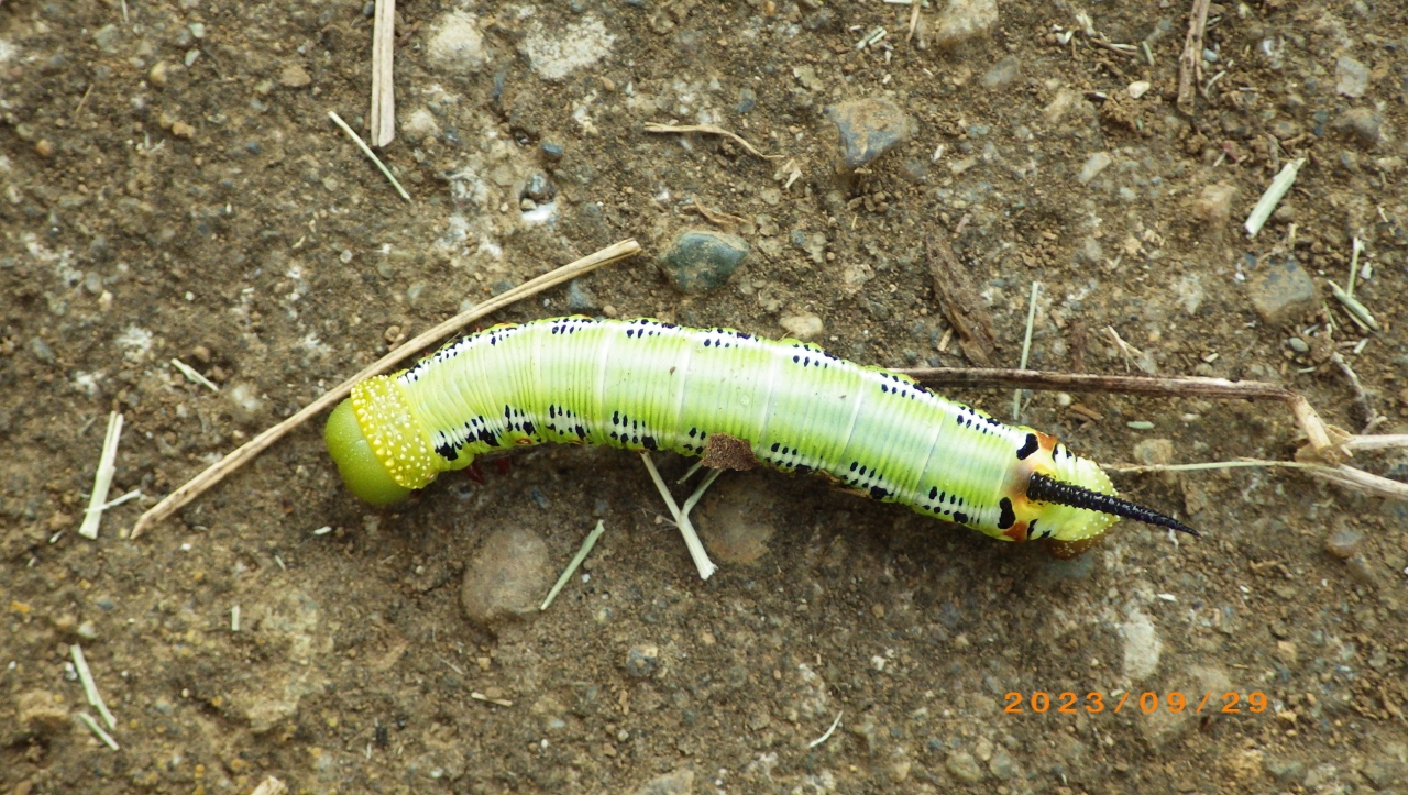 オオスカシバ(幼虫)・・・庭の草花に成虫は見かける。この度、念願叶って幼虫と出会えた。黄色い襟巻のような顆粒、薄緑色の身体に黒い斑点、尖った尾角など、なんと洒落た模様の幼虫だろう。 |