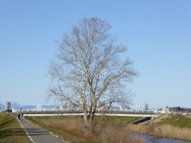| 芝川のシンボル“プラタナス”も、この日は寒さをじっと耐えているよう。 |