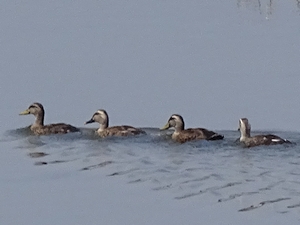 さあ、ここで問題発生です。水面を仲良く移動するカルガモ4羽。親子でしょうか、などと言っていると、どうも違和感があります。よく見ると先頭と3番目の2羽は嘴が黄色です。幼鳥は黄色い?そんなことななさそうです。