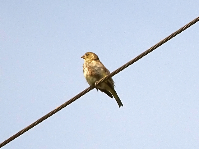 | グランドの横を抜け調整池の手前までくると、住宅街の電線に小鳥がとまっています。羽根には際立った色や模様が見られず、さてなんでしょう?すぐ先にはカワラヒワがとまっていて、この尾羽も同じく典型的なV字だったことから、”カワラヒワ”という判定でした。 |