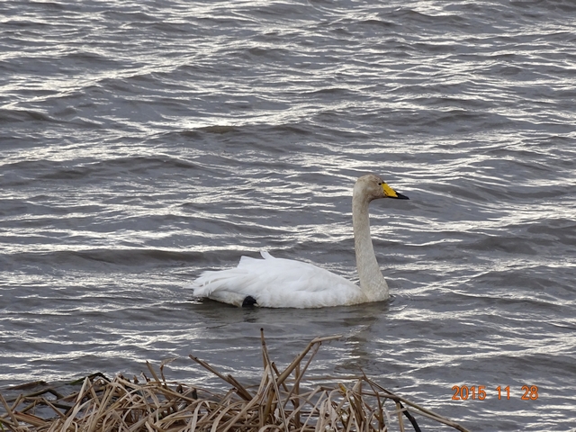| 定点観察を終えて次は沼を一周します。間近にオオハクチョウやオオヒシクイの見られるところがあり、ここではカモ類もよく観察できました。伊豆沼・蕪栗沼周辺はオオハクチョウが多いのですが、よくよく探すとコハクチョウもいます。また、一部の方のみでしたが、ヨシガモやトモエガモも。 |