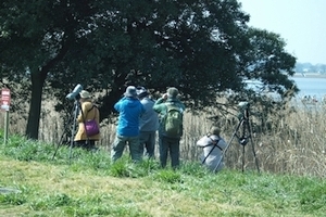 群馬県野鳥の会館林分会長のOさんからご挨拶と説明をいただきました。昨日も千葉支部の方々が大型バスで訪れ、付き添われて6キロ歩かれた由、ほんとうにご苦労さまです。北帰行がすでに始まっていて、オオハクチョウはすでに去り、シギ・チ類もほとんどいないとのお話。ちょっと残念ですね。ところが、すぐにクイナ出現の知らせ、みな色めき立ちます。 |