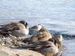 浜を東へ戻り、防波堤まで来ると様子が一変。まずは手前の岸でお休み中のオナガガモの先でハマシギが忙しそうに採餌をしています。そしてトウネンも1羽でてきました。海上を探すとビロードキンクロの雄が。どうも毎年のお馴染みさんの様です。さらにホオジロガモの雄もしっかり見られました。