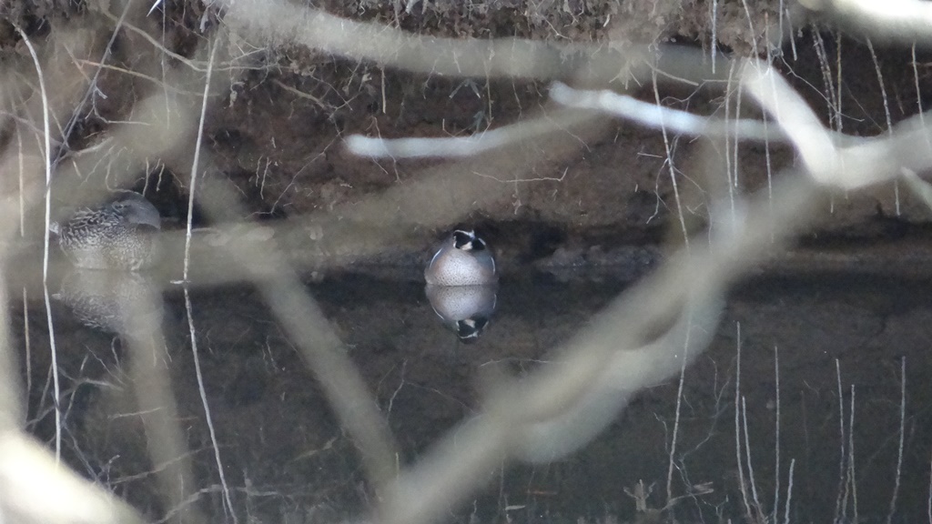 鳥が出過ぎて、時間が足りません。それでもしっかり山田大沼でカモ観察。ここで、メインリーダーの予言が的中。対岸水面の木陰にオシドリ! マガモに交じって♂2、♀1。