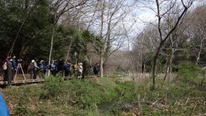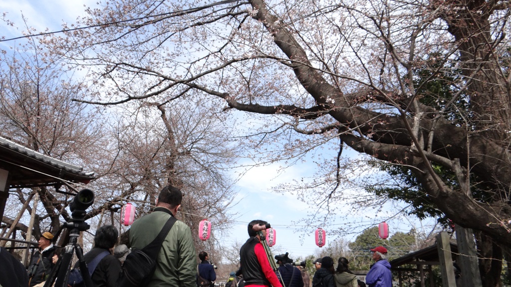 毎年恒例のお花見探鳥会。桜(ソメイヨシノ)の開花宣言が早かった割に、その後の花冷えのせいで、開き方が進まない今年、私の記憶する限りでは、初めてこの定例探鳥会がエドヒガンの満開にぶつかりました。メインリーダーのYさんの挨拶が始まると、上空にオオタカが出現! 目聡いOリーダーと参加者の一人が、サシバが飛んでいるのも確認しました。さあ、桜と鳥を求めてのお花見探鳥会の始まりです。