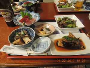左:ふるさとの湯で旅の疲れを癒した後、めがね岩付近を夕暮れ散歩。風呂上りなのに、しっかり観察用具を持っています。温泉で熱った体に、海風が心地良いひと時でした。右:新鼻荘のディナー。島で採れた魚と野菜が中心の、素朴な島料理に箸が進みます。食事半ばで出された、揚げたての明日葉の天ぷらも絶品でした。