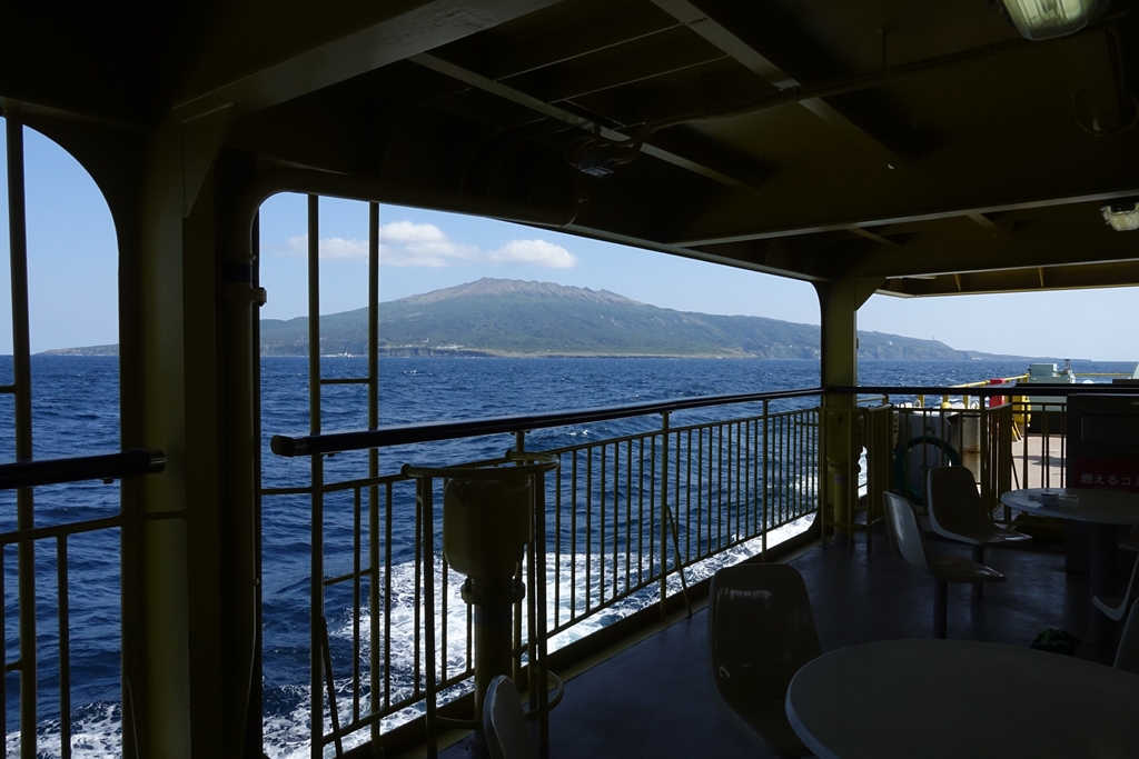 左:錆ヶ浜港を14時に出航し、三宅島を後にしました。中:海鳥観察の舞台、橘丸の第5デッキ右舷から三宅島。右:海鳥観察開始。強風と寒気を避け、左舷の陽だまりに。