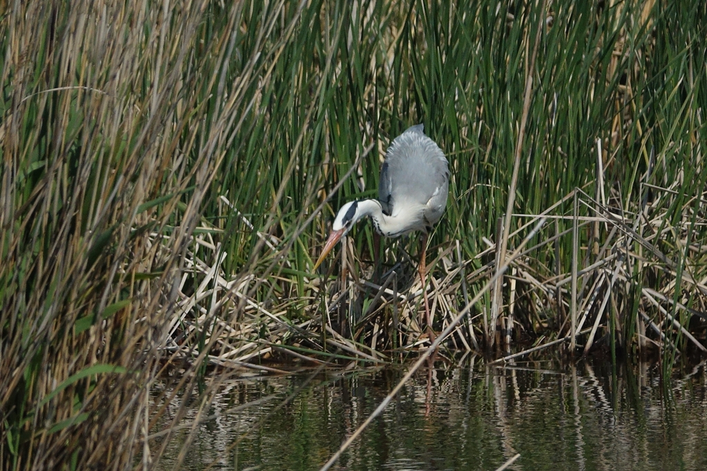 | 次に、鳥類園の淡水池での探鳥です。すっかり婚姻色になったアオサギが、魚を狙っています。ギャラリーの期待に応えて、何度も小魚を捕獲して食べてくれました。 |