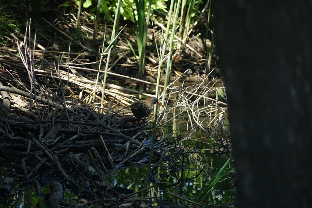 | ウォッチングセンターで小休止と探鳥を楽しんで外に出ると、「ヒクイナがいた」との情報。何人かの幸運な方が、確認されました。同じ場所に、今度はクイナも登場。こちらは全員で確認できました。その他に、池のあちこちに設けられたハイドからアオアシシギやチュウシャクシギの姿を間近に観察することが出来ました。 |