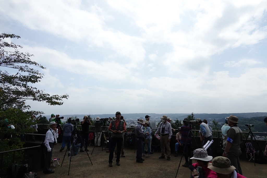 | 猛烈な暑さの夏が過ぎ、爽やかな秋の到来と思ったら、どうも今年の秋は雨が多い。サシバも何時渡ろうか悩んでいることでしょう。9月24日(月・祝)、支部のタカの渡り調査が飯能市の天覧山展望台で行われました。9時開始時刻の前から、多くの会員が集結しました。ここ天覧山では、爆発的な渡りが今年はまだ記録されていません。「今日こそは」と、期待に胸ふくらませての登頂です。今年も、「天覧山・タカ渡り観察グループ」の皆さんと一緒に空を見上げて、サシバの到着を待ちました。 |