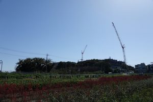 芝川右岸を通って博物館に戻りました。市立病院の建設工事のクレーンが、青空に向かって伸びていました(日曜日は休工中で静かです)。博物館の庭で鳥合わせ。期待していたノビタキには会えませんでしたが、オオタカやノスリやチョウゲンボウが飛び、カワセミもジョウビタキも姿を見せてくれて、大満足の探鳥会でした。何よりも、見沼たんぼの上に広がる青空が、今日の主役だったかな。