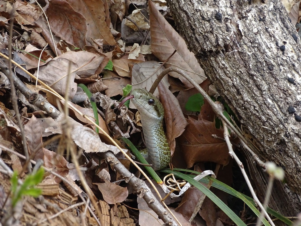 | 山麓駅の先はハイキング道。勾配がきつくなってきましたが、頑張ってついていきます。気がつくと前で人だかりができていますが、見ているのは路傍の地面??どうやらアオダイショウの様です。苦手な方もいるでしょうが、冬眠明けでぼんやりしている感じは、とても愛らしくみえました。 |