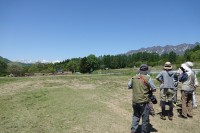 | 正午ころ、バスで戸隠牧場キャンプ場に移動しました。キャンプ場の草原で、旅館の奥さん手作りの弁当と豚汁の昼食。昼休憩の終わるころ、真上の空に、突然ハチクマ2羽(3羽目を見た人も)が飛来! 今シーズン初めての出会いでした。林では、ニュウナイスズメが営巣していました。キャンプ場周辺で探鳥した後、14時過ぎに涼しい木陰で鳥合わせ。50種以上を記録して、探鳥会の幕を閉じました。 |