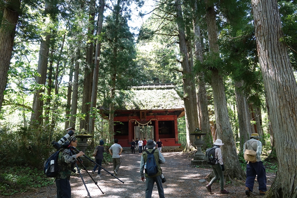 | 何度目の戸隠でしょう。今までで一番の好天に恵まれた二日間でした。長野駅に集合し、迎えのマイクロバスで戸隠森林植物園に向かいました。途中、山が良く見える広場にバスを止め、しばし景色を堪能。遠くに白く見えるのが北アルプスで、左から「鹿島槍」、「五龍」、「唐松」の峰々。右手に連なる茶色の岩山が、戸隠連峰です。森林植物園に10時半ころ到着。入口の地図看板で、今日のコースを確認し、探鳥をスタートしました。森の中は薄暗く、ヒンヤリとしていますが、日向はギラギラで暑く汗ばむくらいです。 |