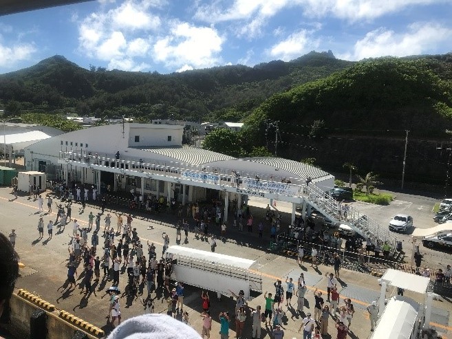 その後は、南島を後にして、父島の港までの途中の海で「箱メガネ」を使って魚の群れを見たり、プカプカと泳ぐウミガメが見られたりと、鳥以外のアクテイビティも楽しめました。あっという間に楽しい時間も終わり、お昼を食べてお土産を買ったら、東京までの出航の時間です。