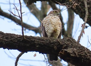 図鑑等ではオス成鳥の胸は橙色が帯びるとあるが、この個体はあまり感じられない。しかし、メスに比べて幅の広い横斑で遠目には白っぽくみえる。メス成鳥は胸から下面にかけて細かい横斑がみられる。おもにスズメやシジュウカラなどを捕食する。オスがけなげに獲物をメスに渡す場面も観察できた。